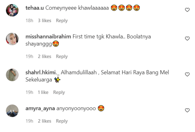 “Tetejut Khawla pestaim raya tiber tiber,” tulis penyanyi Aku Cinta pada ruangan kapsyen.