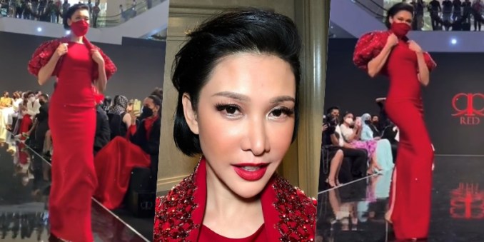 Nasha men.curi perhatian apabila muncul anggun memperagakan busana gaun sendat rona merah sentuhan pereka Rizman Ruzaini.